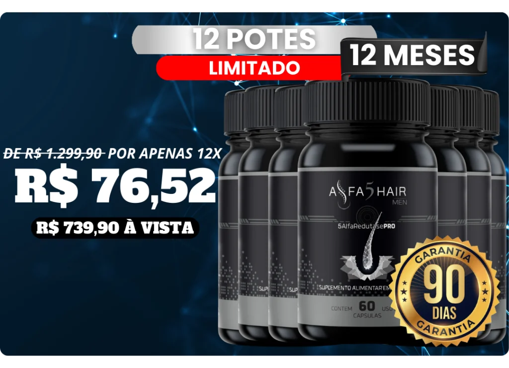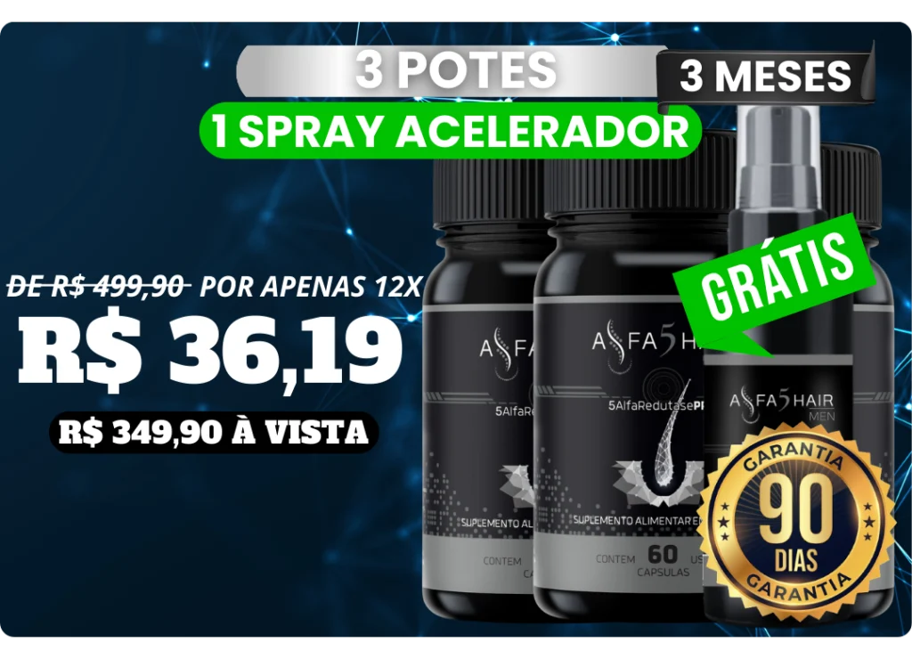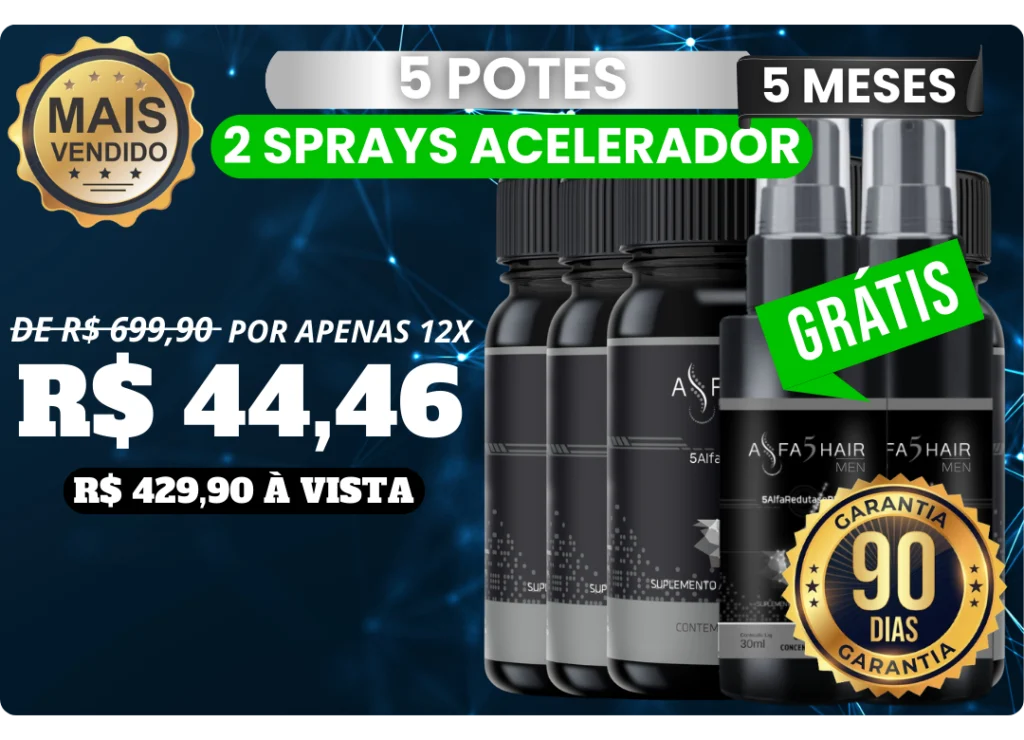Alfa5Hair Men age na raiz do problema com a Tecnologia 5 Alfa Redutase PRO, alta absorção Bio‑Absorb e liberação contínua de ativos ao longo do dia.